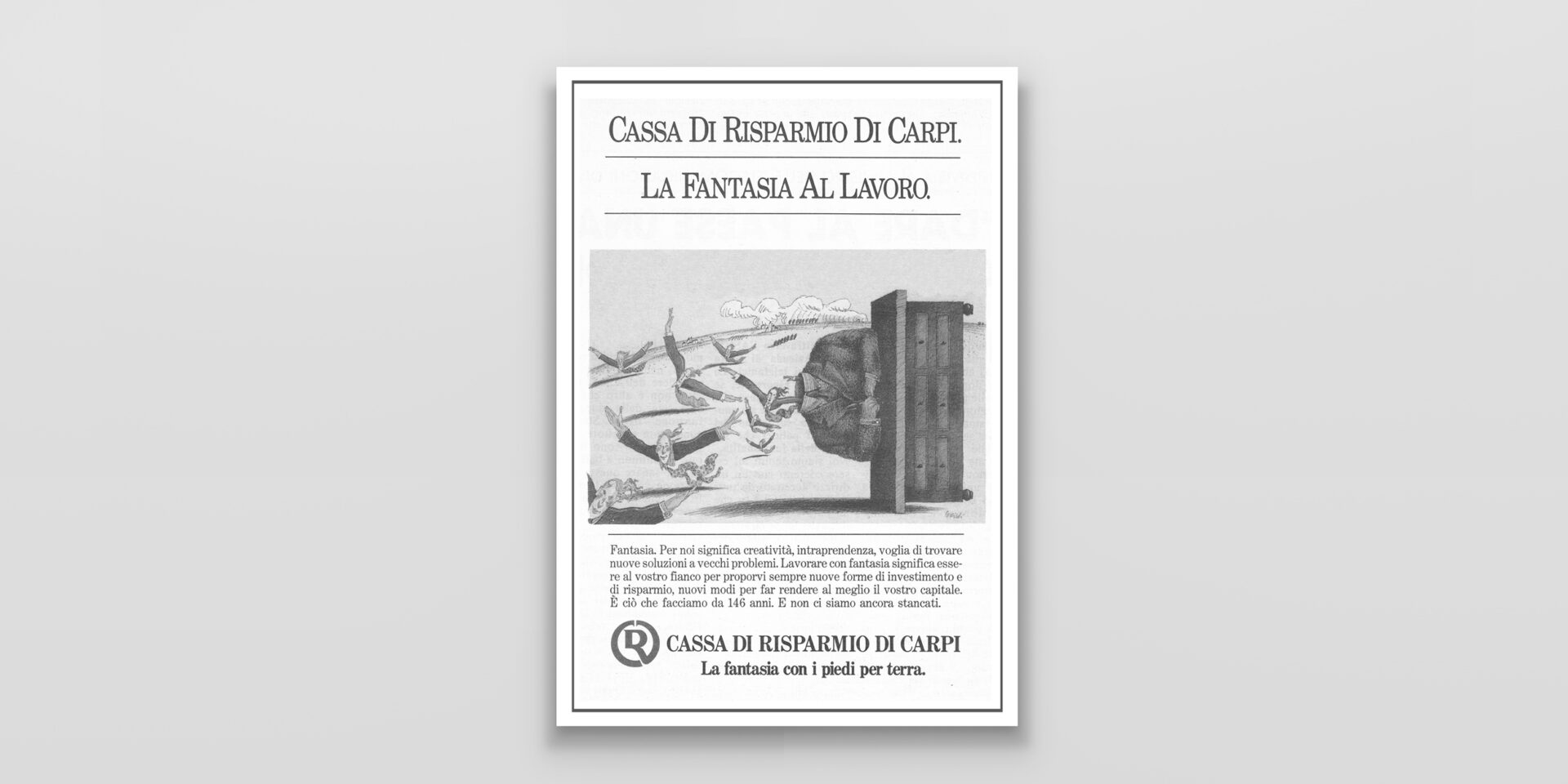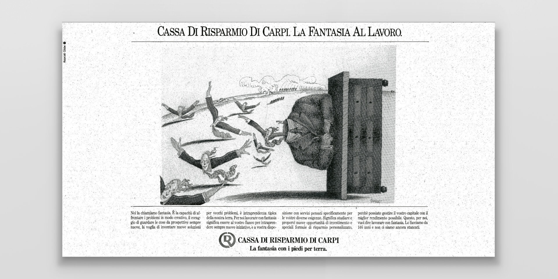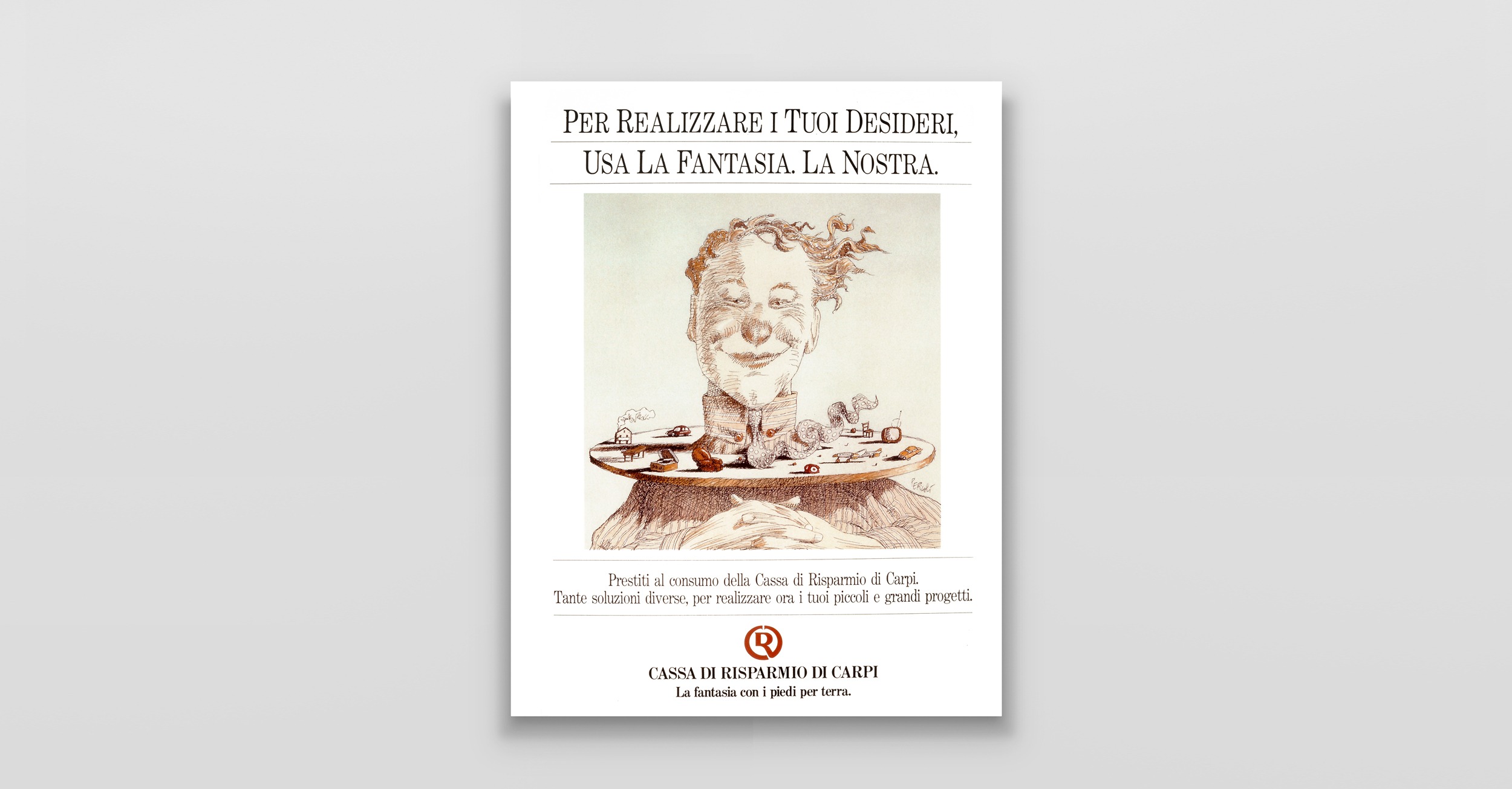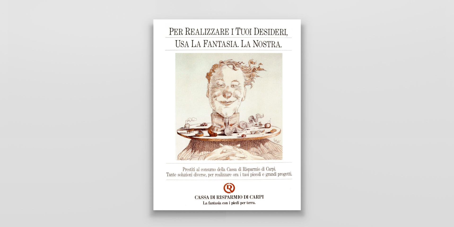 Cassa di Risparmio di Carpi "Fantasia al lavoro" La fantasia entra in banca, con una campagna interpretata dalle illustrazione di Tullio Pericoli. Dall’immagine coordinata all’advertising alle locandine sul punto vendita. Cliente:Cassa di Risparmio di Carpi Settore:Servizi finanziari Agenzia:Associati Globe – Periscopi Creatività:Marco Castori Share this: