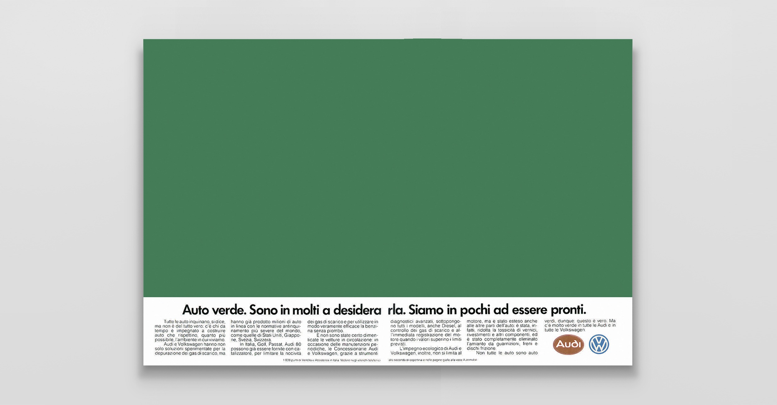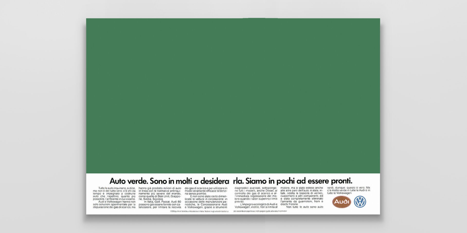Il gruppo Audi Volkswagen comincia a pensare ad automobili meno inquinanti anticipando i tempi. Il visual è un semplice fondo verde, sintesi estrema.